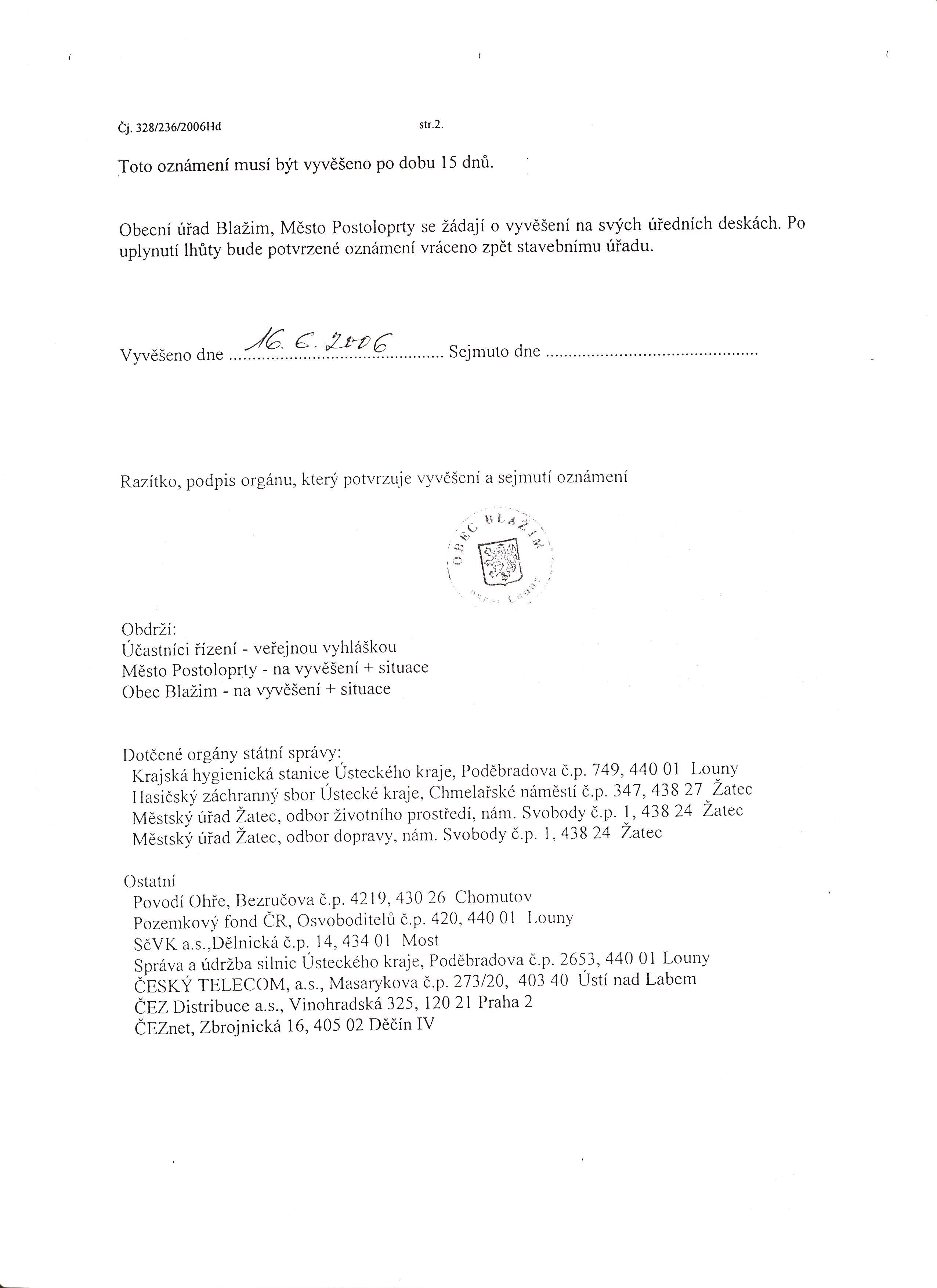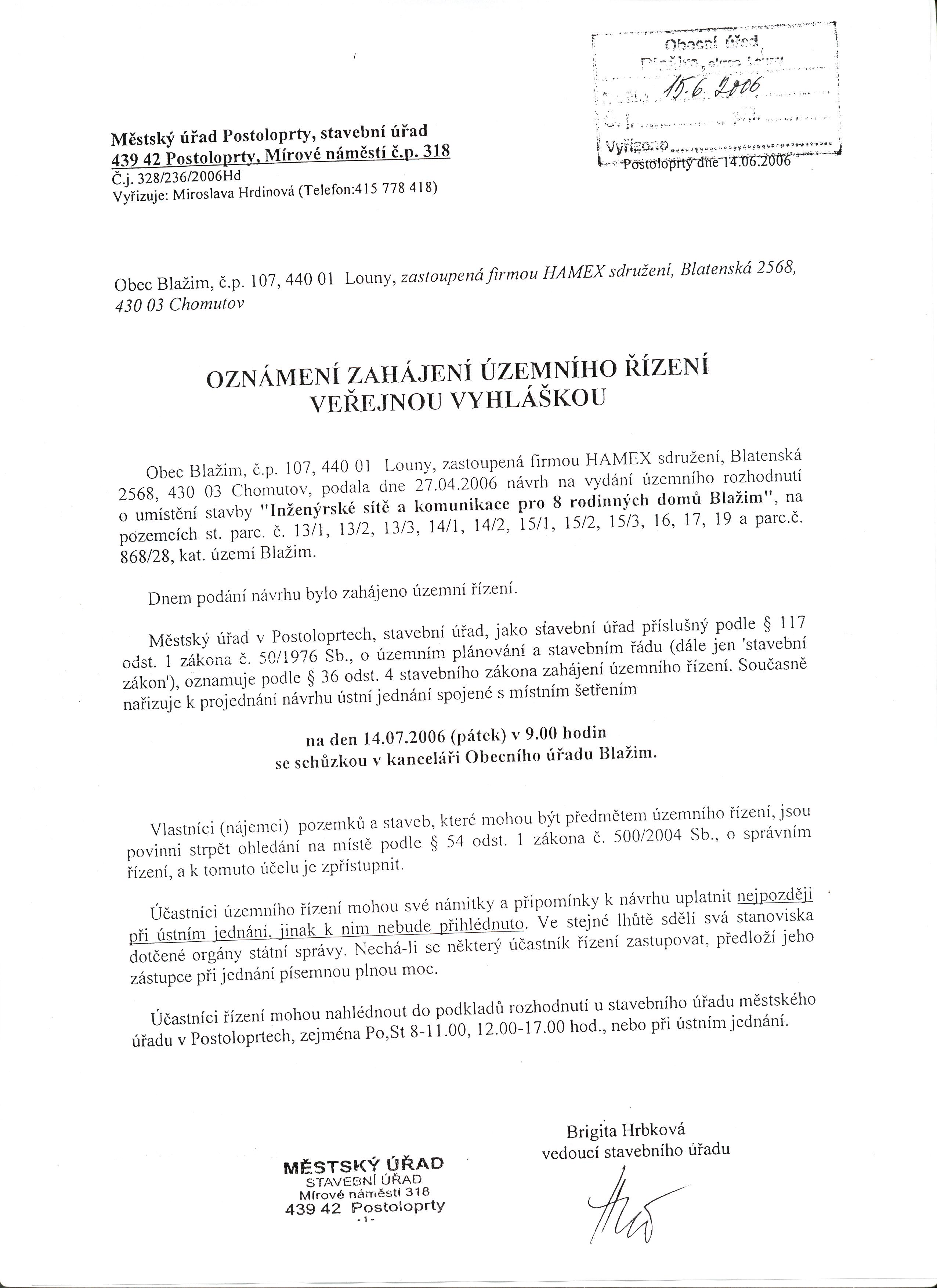 OZNÁMENÍ ZAHÁJENÍ ÚZEMNÍHO ŘÍZENÍ VEŘEJNOU VYHLÁŠKOU "INŽENÝRSKÉ SÍTĚ A KOMUNIKACE PRO 8 RD BLAŽIM"doc.doc.doc. VYVĚŠENO OD 16.06.2006 DO 03.07.2006