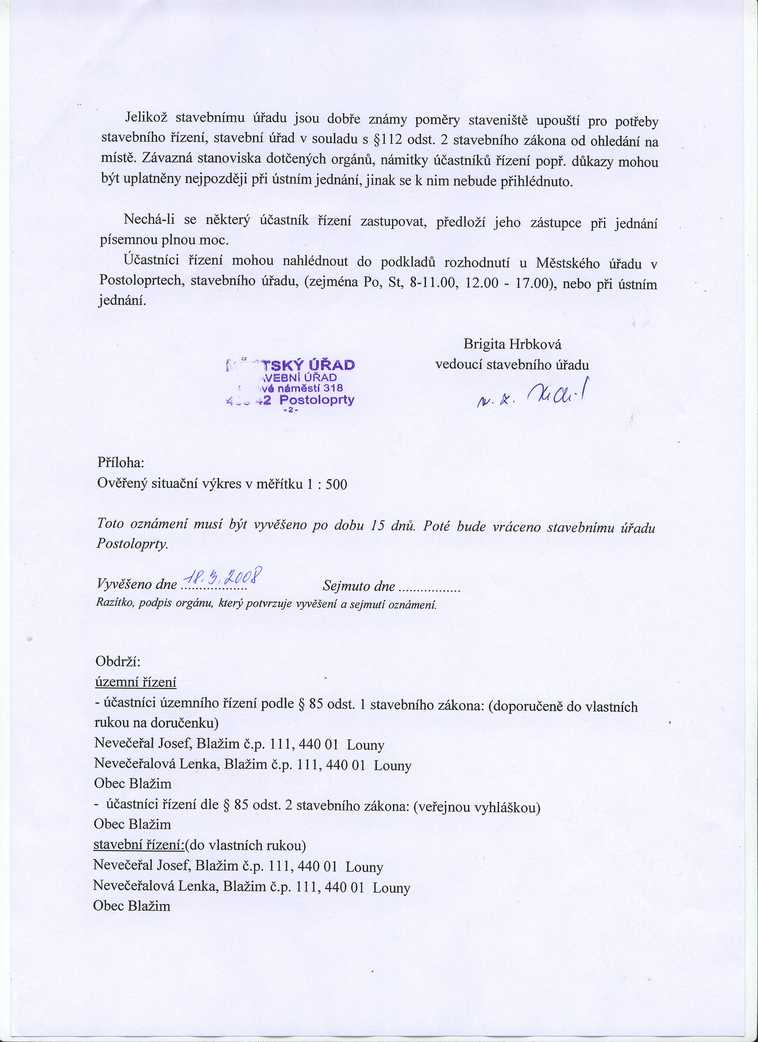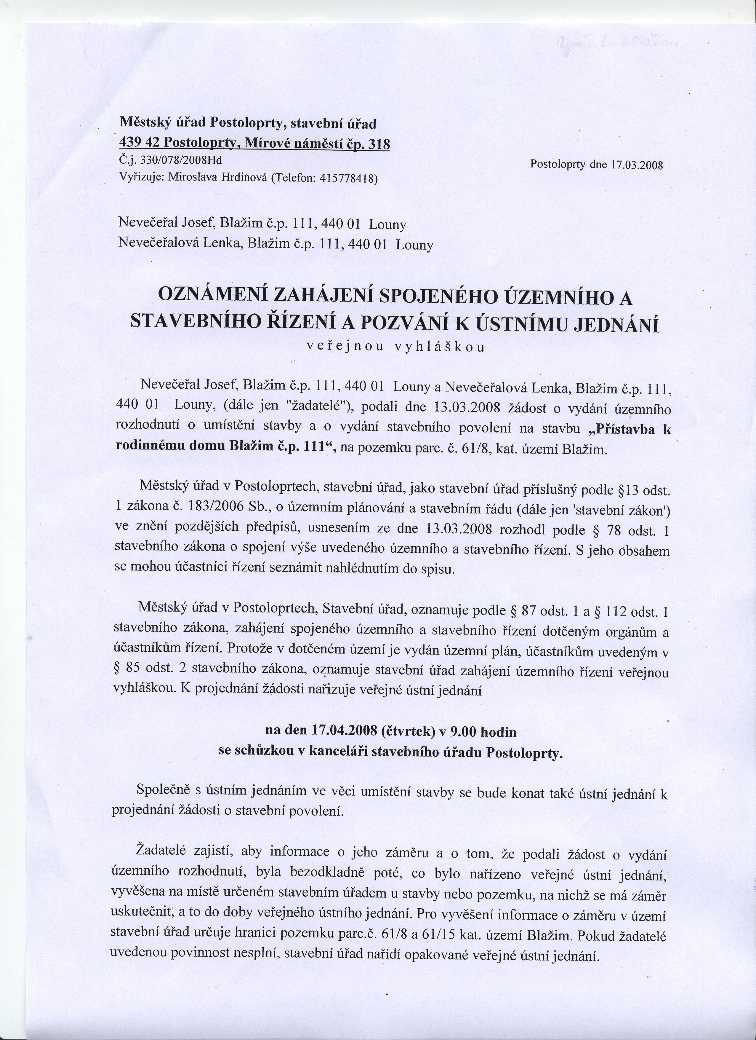 OZNÁMENÍ ZAHÁJENÍ SPOJENÉHO ÚZEMNÍHO A STAVEBNÍHO ŘÍZENÍ A POZVÁNÍ K ÚSTNÍMU JEDNÁNÍ VEŘEJNOU VYHLÁŠKOU /NEVEČEŘALOVI/ doc.doc. VYVĚŠENO OD 18.03.2008 DO 04.04.2008